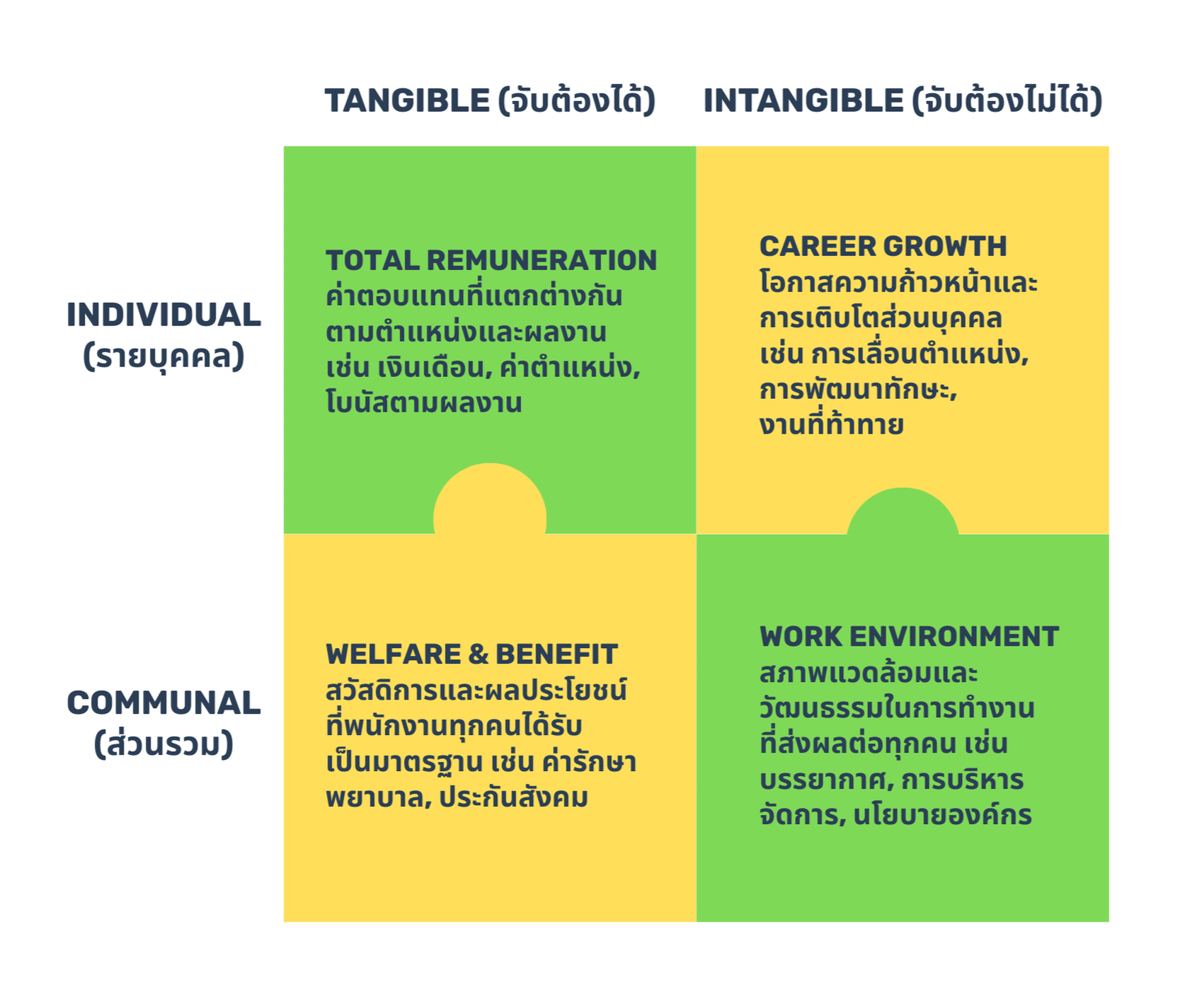 เมื่อนำสองแกนนี้มาซ้อนกัน ก็จะได้องค์ประกอบของรางวัลออกมาเป็น 4 กลุ่มหลัก ซึ่งช่วยให้องค์กรออกแบบกลยุทธ์การจูงใจได้อย่างสมดุล ไม่ผูกทุกอย่างไว้กับเงินเดือนเพียงอย่างเดียว